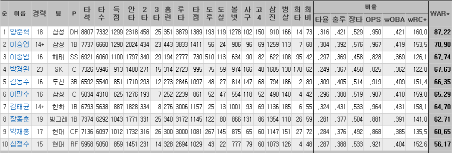 kbo 역대 war순위