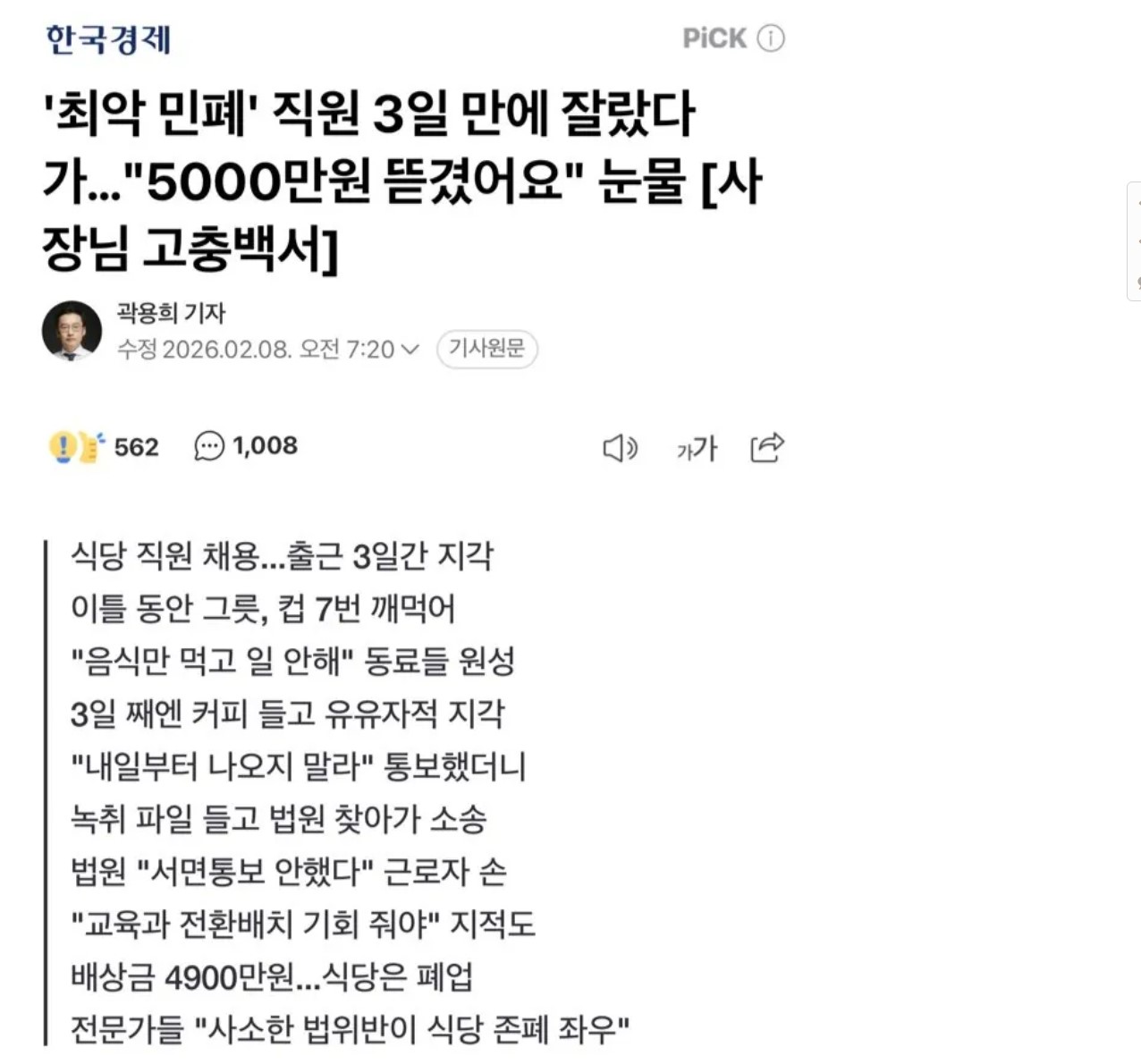 민폐 직원 3일만에 잘랏다가 5000만원 뜯긴 사장