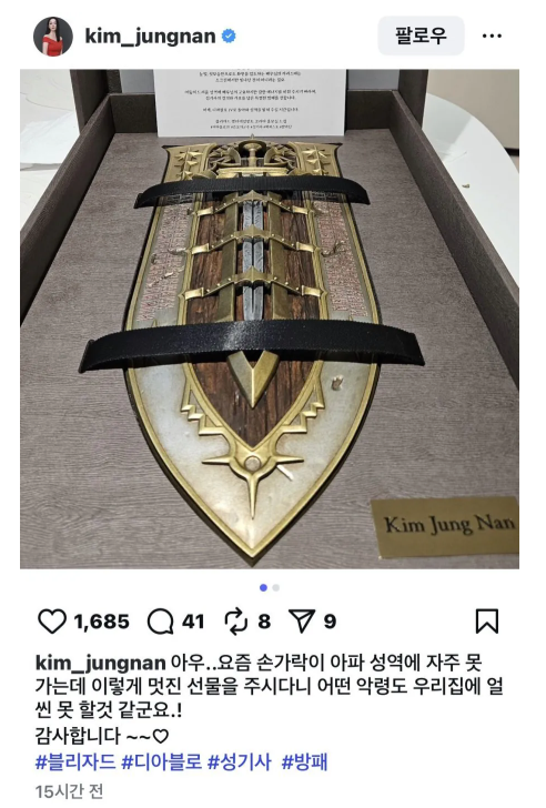 G 비회원 이슈 0 5 0 0 2시간전 배우 김정난이 블리자드에서 받은 방패 우왓 ㅋㅋㅋ 출처 : https://m.bboom.naver.com/best/get?boardNo=9&postNo=4357353 0 0 이 글을 SNS로 공유하기