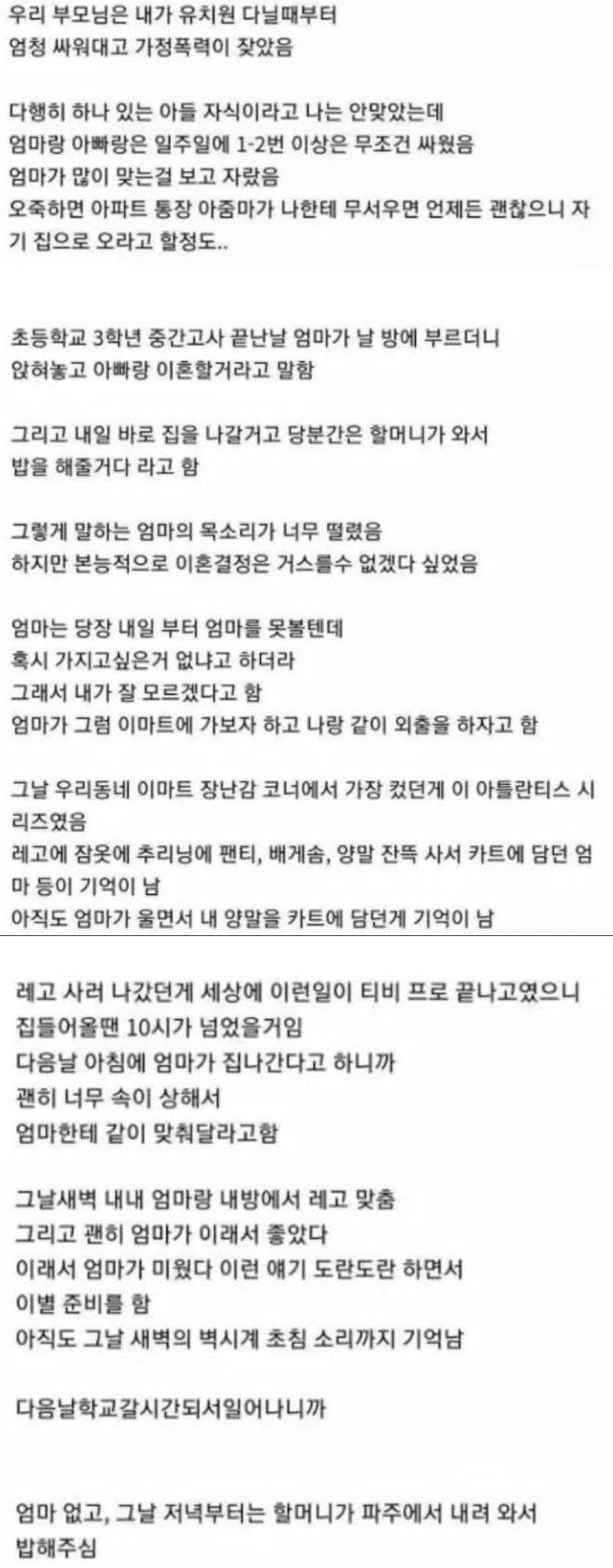 G 비회원 이슈 0 5 0 0 4시간전 가정폭력으로 집을 떠난 엄마와의 마지막 추억 출처 : https://m.bboom.naver.com/best/get?boardNo=9&postNo=4360543 0 0 이 글을 SNS로 공유하기