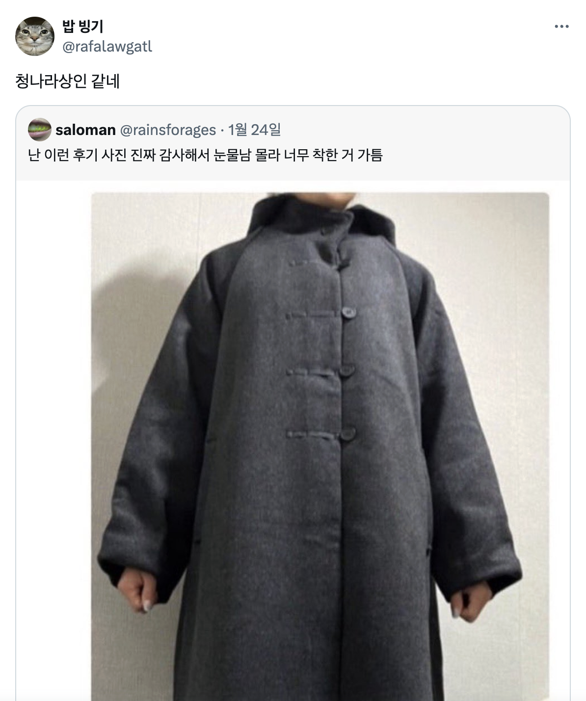 G 비회원 이슈 0 5 0 0 2시간전 청나라 상인 코트 대부분 코트입으면 저런 핏 나옴 ㅜㅜ 출처 : https://m.bboom.naver.com/best/get?boardNo=9&postNo=4363467 0 0 이 글을 SNS로 공유하기