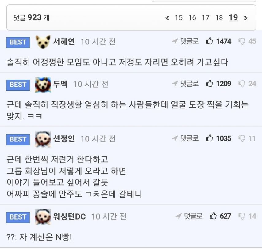 G 비회원 이슈 0 7 0 0 2시간전 갑자기 회식이 하고 싶었던 대기업 회장 출처 : https://m.bboom.naver.com/best/get?boardNo=9&postNo=4345636 0 0 이 글을 SNS로 공유하기