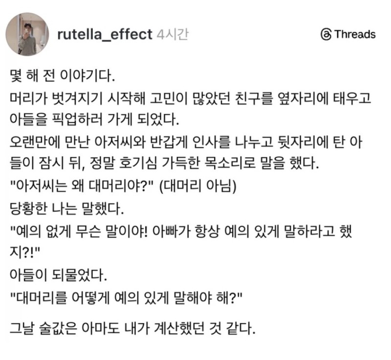 머리 빠지기 시작한 친구보고 아들이 한 말