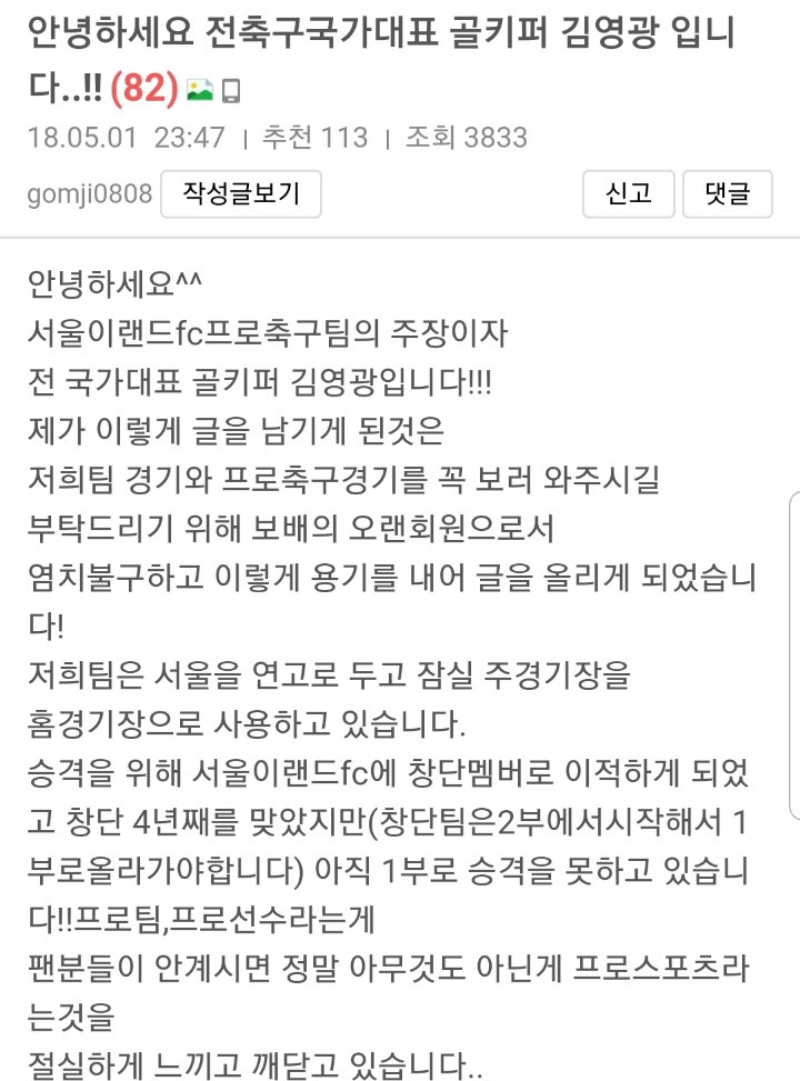 김영광 선수가 보배드림에 남긴 글