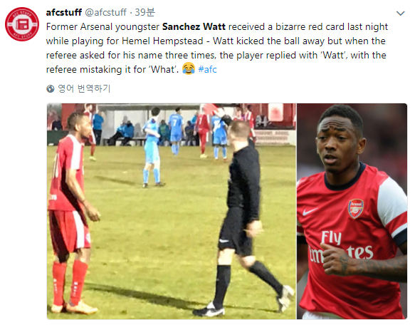 비회원 해외축구 0 550 0 0 2018.03.08 06:59 이름 때문에 퇴장당한 선수 전 아스날 출신 산체스 와트는 어제 퇴장을 당함. 와트가 경고를 받았는데 심판이 이름이 뭐냐고 3번 물어봄. 와트는 'Watt'라고 대답함. 심판은 'What'으로 알아듣고 항의하는걸로 판단해서 퇴장 줌. 진짜 이름이 뭔지 물어보려고 주장을 부름. 다행히 퇴장은 번복됨 0 0 이 글을 SNS로 공유하기
