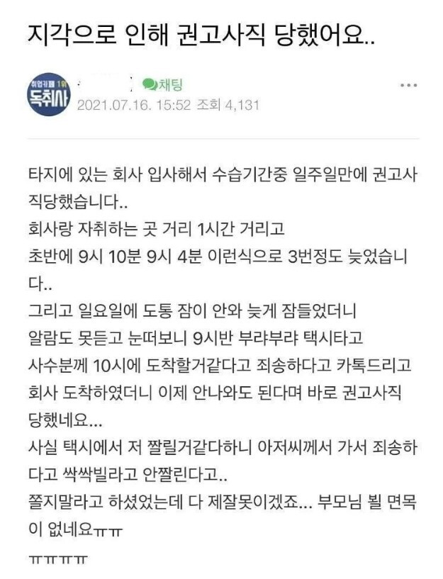 G 비회원 이슈 0 5 0 0 3시간전 지각으로 인해 권고사직 당했어요.jpg 일주일에 네 번 지각... 출처 : https://m.bboom.naver.com/best/get?boardNo=9&postNo=4352229 0 0 이 글을 SNS로 공유하기