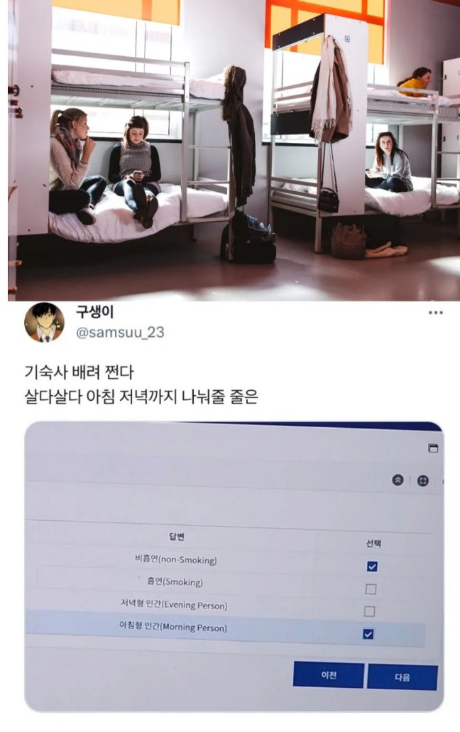 G 비회원 이슈 0 7 0 0 2시간전 기숙사 방 배치.jpg 코골이도 추가해주세요~~~ 출처 : https://m.bboom.naver.com/best/get?boardNo=9&postNo=4360443 0 0 이 글을 SNS로 공유하기
