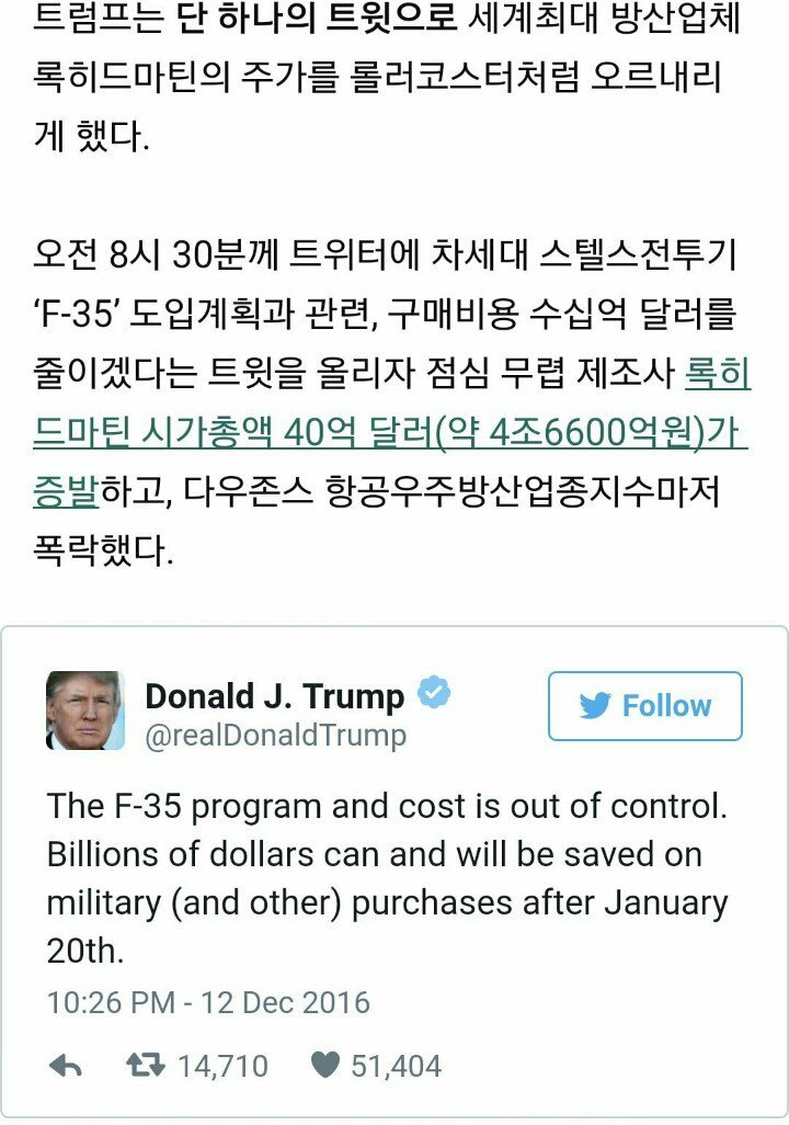 비회원 군사무기사진 0 1394 0 0 2016.12.28 13:08 4조원을 날린 트윗 4조원을 날린 트윗 참고로 트럼프는 후보 시절에도 JSF사업에 부정적인 반응을 보인 적이 있다. 0 0 이 글을 SNS로 공유하기