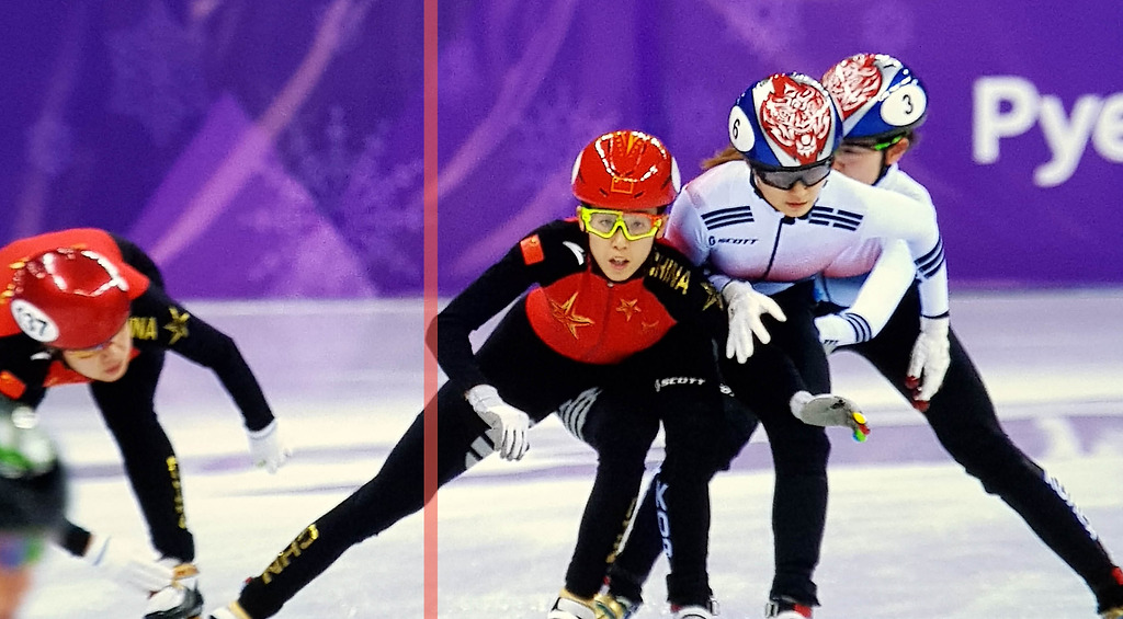 During China’s final relay exchange, the activate Chinese skater drastically changed lane from the outside to the inside, impeding the active Korean skater.