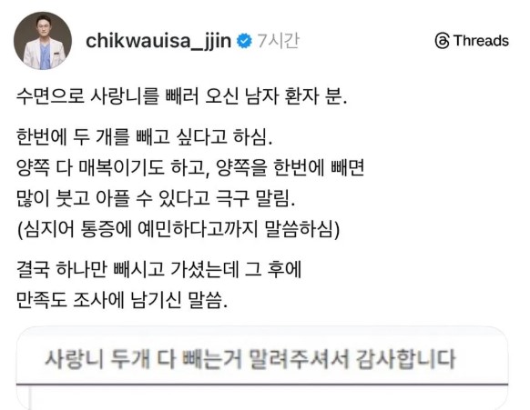 G 비회원 이슈 0 5 0 0 3시간전 사랑니 빼러 치과 온 환자 후기.jpg 어휴 ㄹㅇ 사람 하나 살렸음 ㅋㅋㅋㅋㅋㅋㅋㅋ 출처 : https://m.bboom.naver.com/best/get?boardNo=9&postNo=4355034 0 0 이 글을 SNS로 공유하기