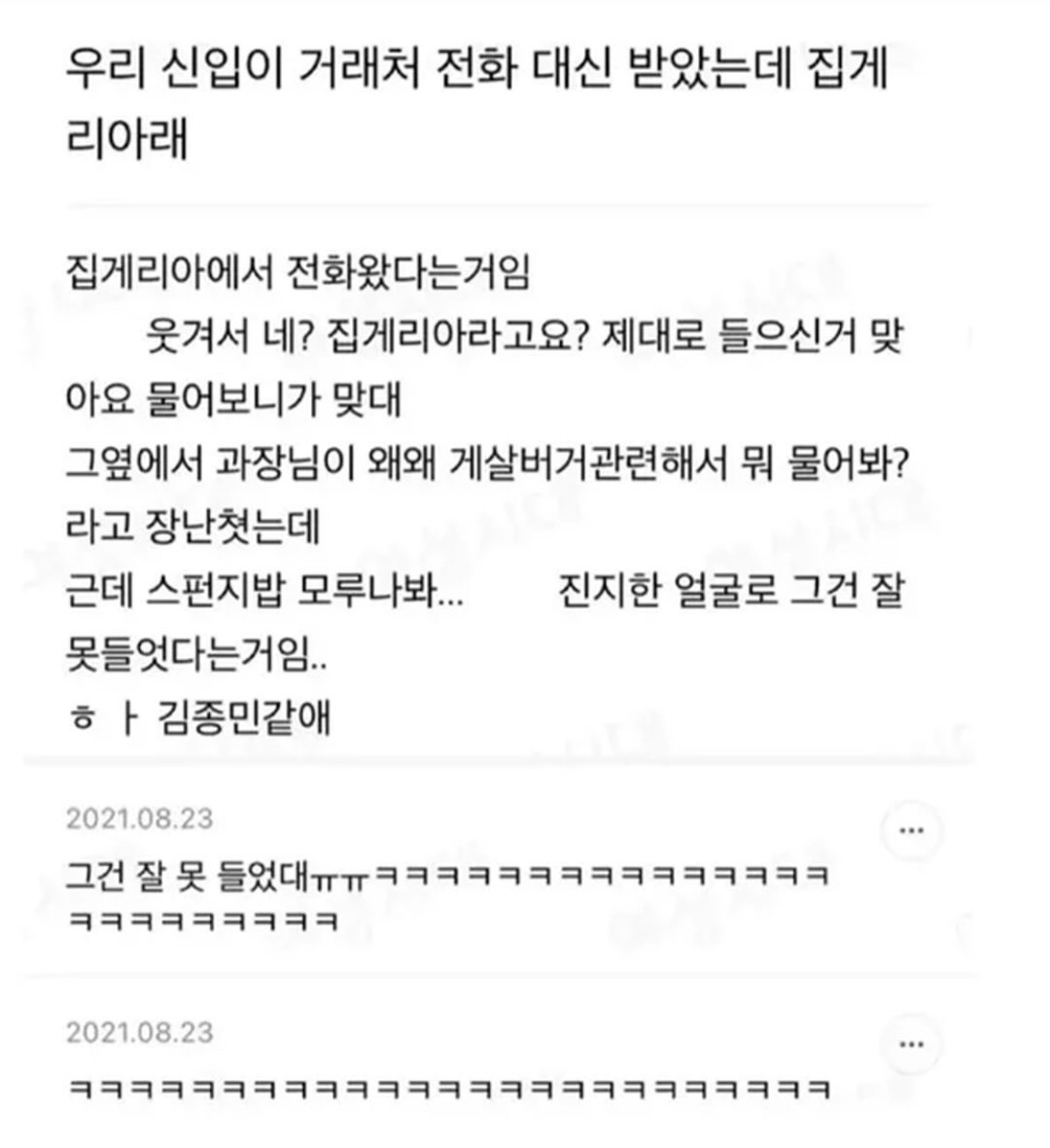 G 비회원 이슈 0 9 0 0 2시간전 신입이 거래처 전화 대신 받았는데 아닠ㅋㅋㅋㅋㅋㅋㅋㅋㅋㅋ 출처 : https://m.bboom.naver.com/best/get?boardNo=9&postNo=4354448 0 0 이 글을 SNS로 공유하기
