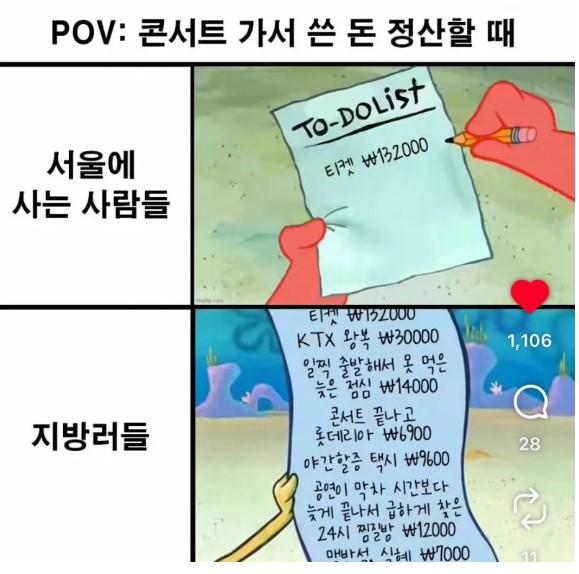 G 비회원 이슈 0 9 0 0 11시간전 서울 사람과 지방 사람의 콘서트 가서 쓴 돈 정산 차이.jpg ㅇㅈ ㅋㅋㅋㅋㅋㅋㅋㅋㅋㅋㅋ 출처 : https://m.bboom.naver.com/best/get?boardNo=9&postNo=4357259 0 0 이 글을 SNS로 공유하기