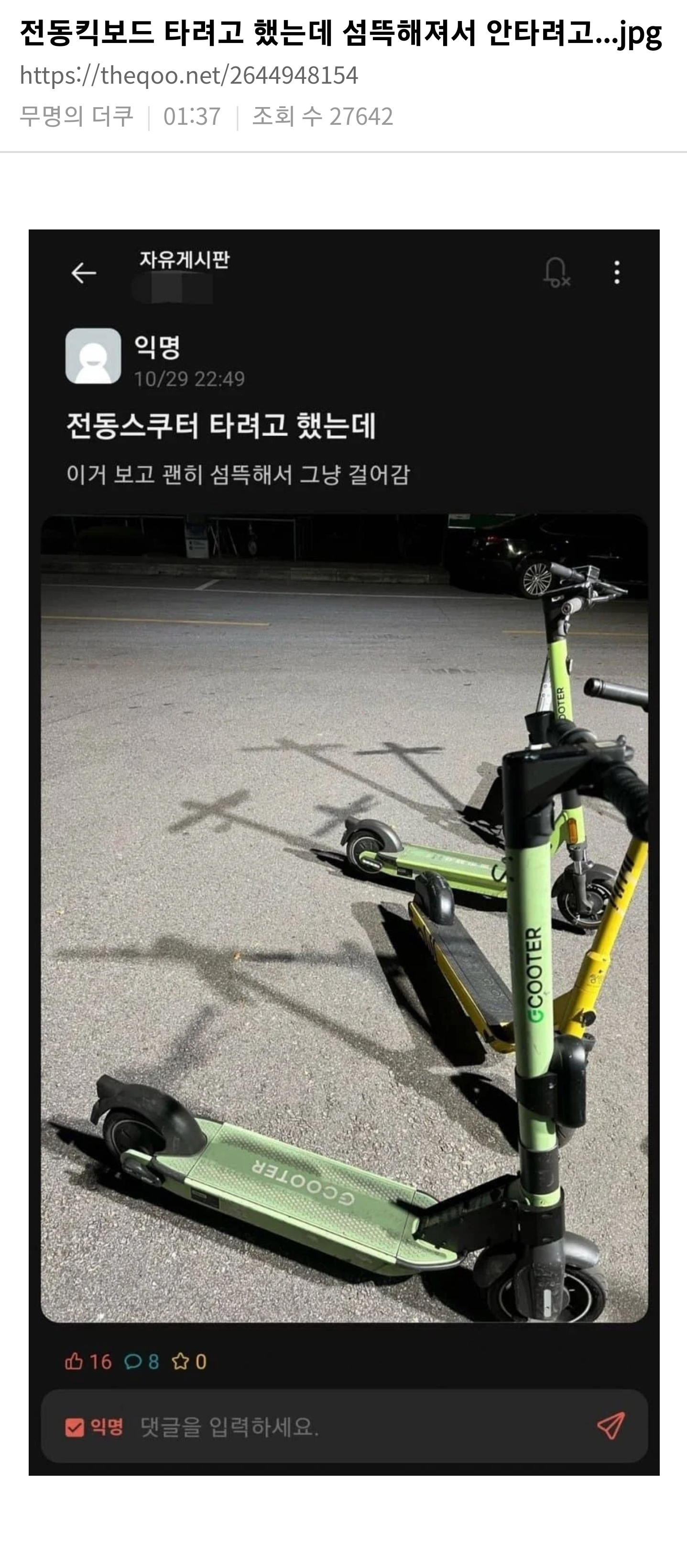 G 비회원 이슈 0 8 0 0 01.10 17:00 전동킥보드 타려고 했는데 섬뜩해져서 안타려고. 촬영일시 : 2022:11:22 10:28:00 출처 : https://m.bboom.naver.com/best/get?boardNo=9&postNo=4356833 0 0 이 글을 SNS로 공유하기