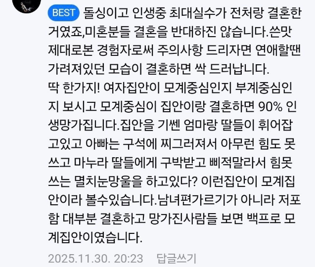 G 비회원 이슈 0 12 0 0 11시간전 돌싱남이 미혼남성에게 보내는 경고 출처 : https://m.bboom.naver.com/best/get?boardNo=9&postNo=4359231 0 0 이 글을 SNS로 공유하기