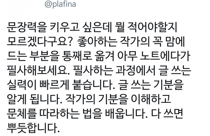 G 비회원 이슈 0 10 0 0 3시간전 조금이라도 어린 나이에 필사를 시작해야 하는 이유. twt 필사 뿌듯하긴함vv 출처 : https://m.bboom.naver.com/best/get?boardNo=9&postNo=4357465 0 0 이 글을 SNS로 공유하기