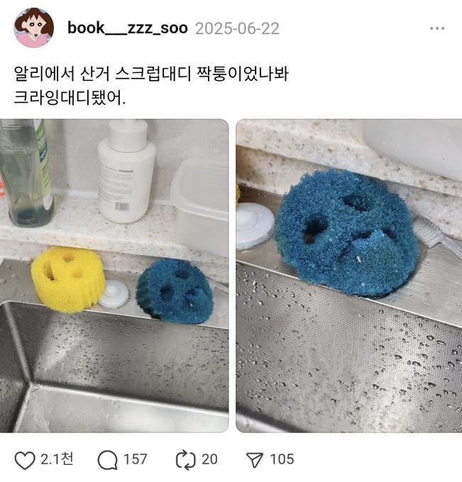 G 비회원 이슈 0 6 0 0 3시간전 알리에서 산 스크럽 대디 짝퉁.jpg 크라잉 대디 ㅋㅋㅋㅋㅋㅋㅋㅋㅋ 출처 : https://m.bboom.naver.com/best/get?boardNo=9&postNo=4358884 0 0 이 글을 SNS로 공유하기