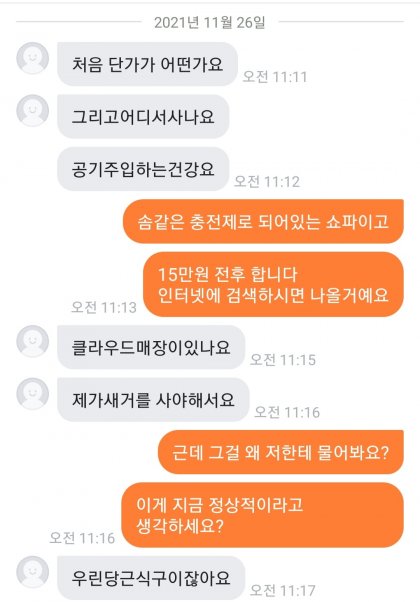 G 비회원 이슈 0 6 0 0 3시간전 당근마켓 방금 온 챗인데 너무 화가 나요 당근마켓 방금 온 챗인데 화가 너무나는데 제가 이상한걸까요 한달남짓 사용한 소파파는데 새거살건데 어디서 사냐고 묻네요 당근식궄ㅋㅋㅋㅋㅋㅋㅋㅋ 출처 : https://m.bboom.naver.com/best/get?boardNo=9&postNo=4358804 0 0 이 글을 SNS로 공유하기