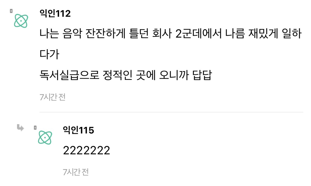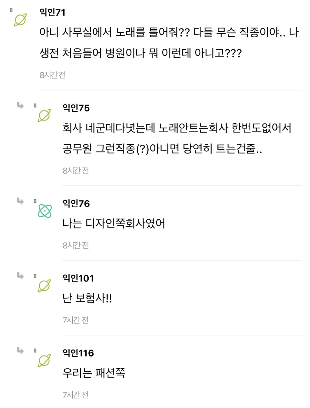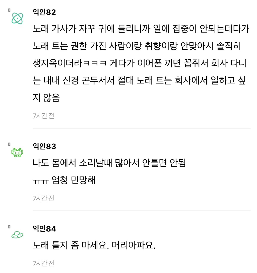 G 비회원 이슈 0 13 0 0 13시간전 다들 노래 트는 회사 거르세요 오 신기하다 틀어주는 회사도 있군요.. 출처 : https://m.bboom.naver.com/best/get?boardNo=9&postNo=4359039 0 0 이 글을 SNS로 공유하기