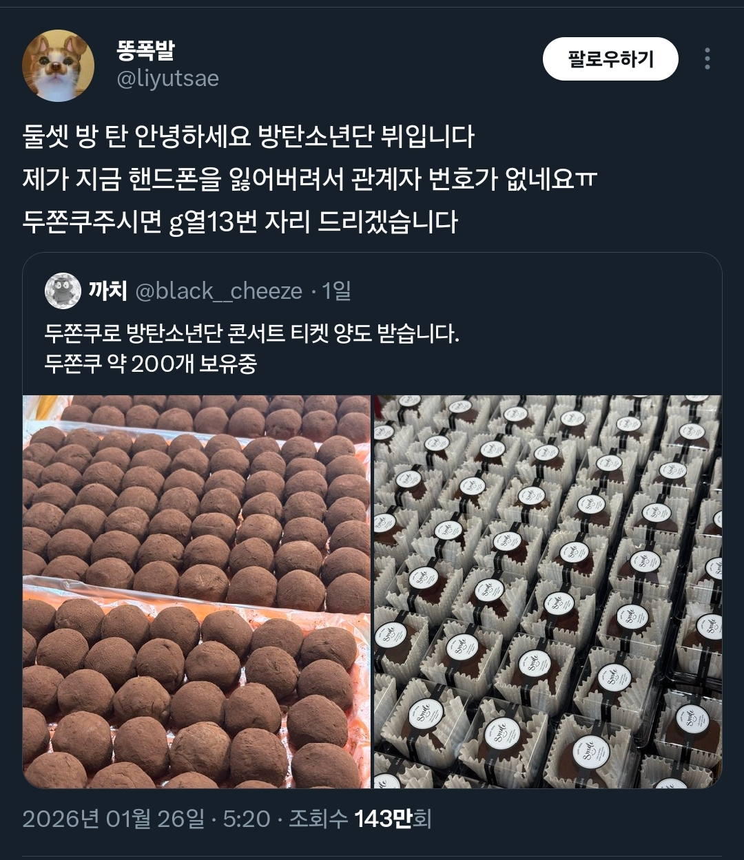 G 비회원 이슈 0 6 0 0 5시간전 두쫀쿠 200개로 방탄소년단 콘서트 티켓 구하는 중인 팬.jpg ㅋㅋㅋㅋㅋ부자다 ㅋㅋㅋㅋㅋㅋㅋㅋ 출처 : https://m.bboom.naver.com/best/get?boardNo=9&postNo=4363913 0 0 이 글을 SNS로 공유하기