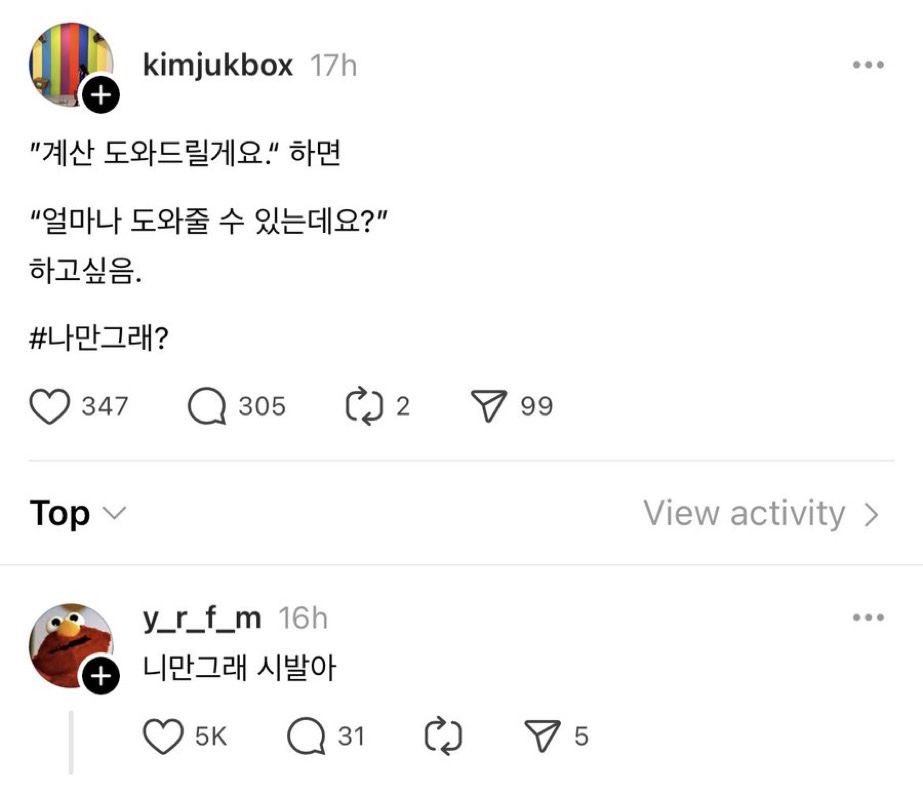 G 비회원 이슈 0 5 0 0 3시간전 "계산 도와드릴게요" 하면 출처 : https://m.bboom.naver.com/best/get?boardNo=9&postNo=4364944 0 0 이 글을 SNS로 공유하기