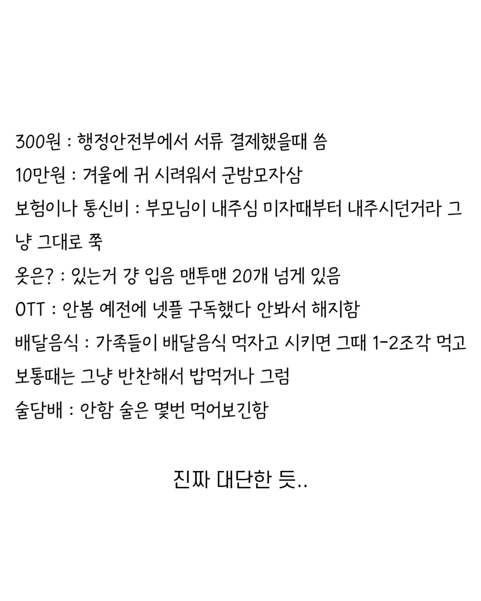 G 비회원 이슈 0 6 0 0 02.21 17:00 부모님 집에서 집밥 먹고 물욕 없는 사람의 한 달 카드값.jpg 와우........ 출처 : https://m.bboom.naver.com/best/get?boardNo=9&postNo=4363977 0 0 이 글을 SNS로 공유하기