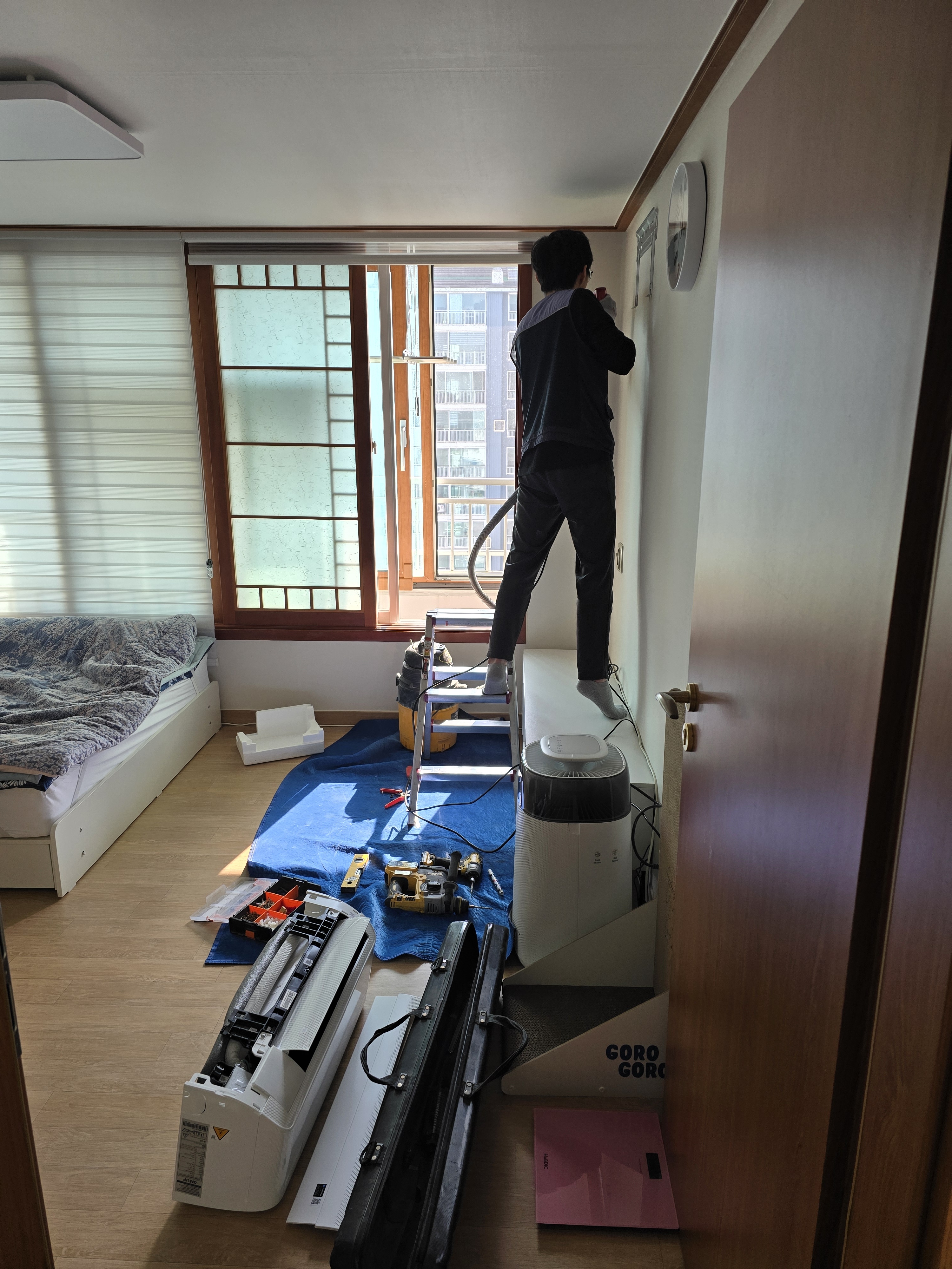 에어컨 설치하는 날이라 노멀이 방에 넣어줬는데