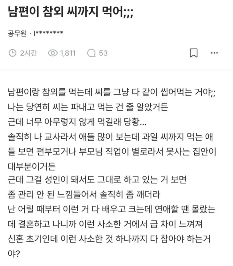 G 비회원 이슈 0 9 0 0 2시간전 남편이 참외 씨까지 먹어 급차이 느낀 교사 출처 : https://m.bboom.naver.com/best/get?boardNo=9&postNo=4376582 0 0 이 글을 SNS로 공유하기