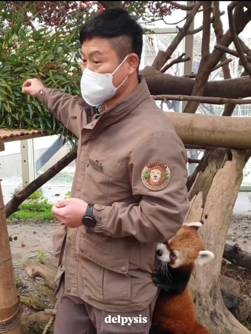 부끄러워서 사육사 뒤로 숨는 레서판다.jpg