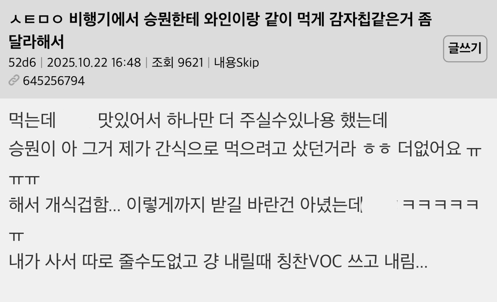비행기에서 승무원한테 와인이랑 같이 먹게 감자칩 같은거 좀 달라해서